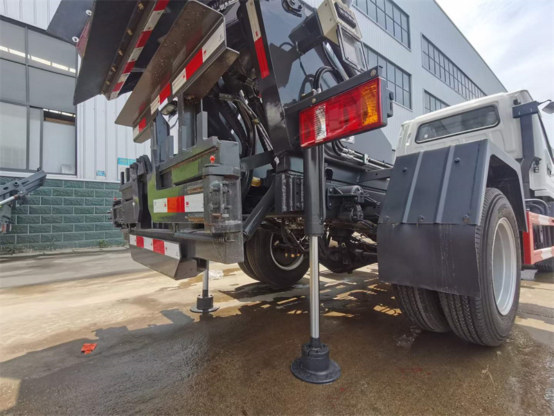 1、到達垃圾站,伸出支腿,傾翻垃圾箱,打開刮板,傾倒垃圾。