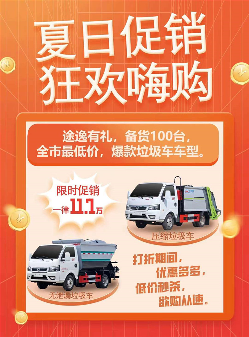 程力環衛垃圾車廠家為提升單品發行量,搶占全國環衛車市場,特備貨100臺東風途逸無泄漏垃圾車和壓縮垃圾車。夏日促銷,狂歡嗨購。