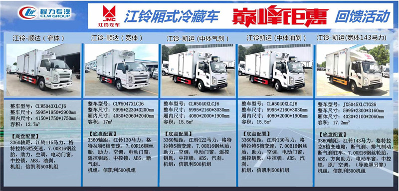 好消息程力冷藏車廠攜手江鈴冷藏車“巔峰鉅惠”回饋活動!冷藏車價格直降3000-8000元。真正做到感恩回饋。此次程力冷藏車活動日期為2022年9月1日-12月31日,拿起電話撥打4006009760,即可享受特價!史無前例的巨大優惠!不容錯過。具體冷藏車價格可隨時咨詢我們。