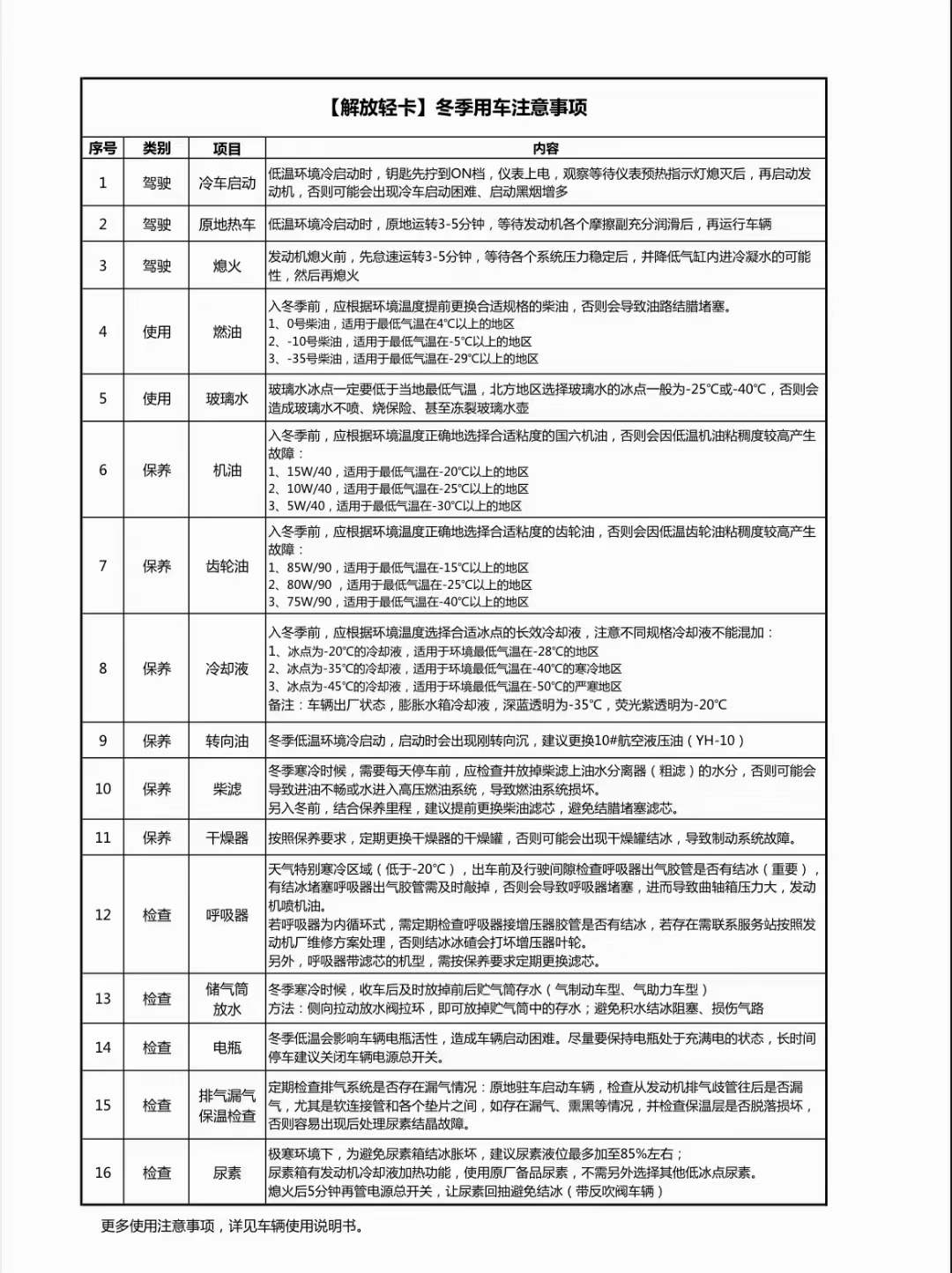 程力解放環衛車溫馨提示:明天開始降溫,請及時更換-10號柴油,并檢查防凍液,玻璃水,機油,尿素是否需要添加和更換。