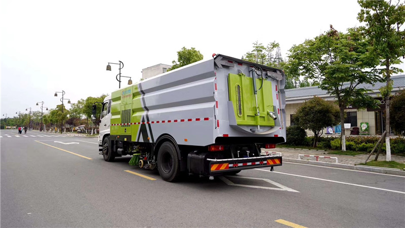 另外,這款東風掃路車清掃作業裝置工作的同時,副發動機驅動配有專用離合器的高壓水泵參與工作。高壓水泵將來自清水箱的清潔水加壓后通過高壓管路控制閥等分別輸送到吸嘴內噴水桿和左、右噴水桿,各噴桿上裝有多個特制的不銹鋼扇形噴嘴,扇形噴嘴噴出的扇形水簾組成一總寬不小于3.5m的U形水刀,直接沖洗路面,沖洗路面后的水被吸回到垃圾箱中,實現路面洗掃。
