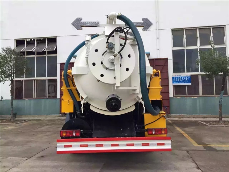 另外,該車污罐:Q235武鋼6MM厚碳鋼板,罐體容積污水罐9個(gè)立方,清水罐3.5立方,采用山東k15的水循環(huán)泵,采用215品孚高壓泵,19高壓管80米,兩根ND100的吸污管標(biāo)配采用億豐大功率10噸真空泵,油水分離器,防溢閥,視糞管,配2根8米吸污管,罐體封頭一次壓鑄成型、罐體帶舉升,后蓋為液壓開啟,罐內(nèi)污物可通過(guò)后蓋直接傾倒。尾部一個(gè)150球閥排污口,帶箭頭指示燈,具有真空度高、噸位大 用途更的特點(diǎn)。