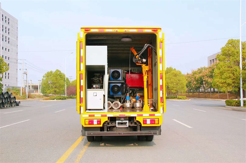 該車主要用作市政搶修,管道維護,抗洪排澇,應急供電等應急搶修作業。該車設備全部由液壓驅動,安全可靠,避免帶電水下作業中有可能引起的安全事故。車載主要設備有1、30L液壓抓斗;2、500kg液壓吊機;3、350L液壓空壓機;4、380/220V液壓發電機;5、4寸液壓渣漿泵2套;6、8寸500m3/小時液壓排澇泵2套。另外可裝載管道機器人,管道光固化等設備。