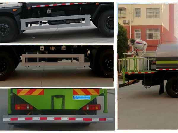 專用裝置為抑塵霧炮,用于城市抑塵,整車長度/軸距的對應(yīng)關(guān)系為(mm):7700/3950,7950/4200,8250/4500,8450/4700,8850/5100,9350/5600;側(cè)防護及后下部防護裝置均采用Q235A材質(zhì),均采用焊接連接,后下部防護尺寸:120×50(mm),離地面高度500mm.ABS型號及生產(chǎn)廠家為:3631010-C2000/東科克諾爾商用車制動系統(tǒng)(十堰)有限公司,J ABS/焦作博瑞克控制技術(shù)有限公司.當整備質(zhì)量為(kg):6680時,軸距為(mm):3950,4200,4500,當整備質(zhì)量為(kg):7280時,軸距為(mm)4700,5100,5600.