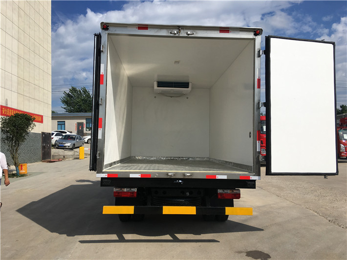 2、廂板材質:外壁板選用國內優質2.5mm玻璃鋼板;中間保溫材料選用80mm聚胺酯保溫板,地板防滑花紋鋁板,后雙開門,門鎖件為不銹鋼,新型橡膠密封條。