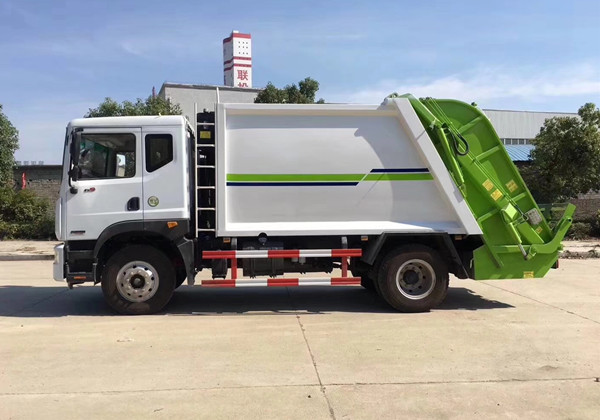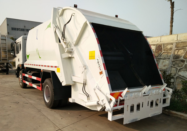 上裝配置:弧形箱體,容積約10-12立方,可裝垃圾8-10噸,采用特種鋼板制作,箱體底板5mm,邊板5mm,廈門銀華油缸,江蘇多路閥,長源液壓油泵,填裝器舉升油缸帶液壓鎖裝置,采用進口西門子PLC電控系統(帶一鍵操作,和手動操作兩種控制方式),電控操作盒三只。帶3個污水收集箱,尾部帶橡膠密封條。填充器加裝后照明燈,箱體油漆及噴字按用戶要求定制。