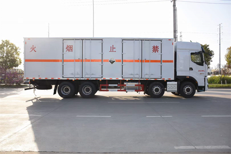 廂體配置:嚴格按照公告尺寸制作,外板采用1mm厚冷軋板有一次性成型的百葉窗,內飾為導電性能良好的鋁板有透氣孔,內襯為矩形管骨架牢靠穩定,內部填充為透氣防潮阻燃的擠塑板,四種材料經現代工藝復合而成,廂體外部上下鋁合金型材包邊,底板和車廂前下部鋪橡膠皮,后門雙開,右側叁個雙開門,內部有固定貨物的臥環,車輛外部有靜電帶、滅火器、防火罩,車廂內安裝煙霧報警器和門防盜報警器,嚴格按照國家危險品相關法規張貼。