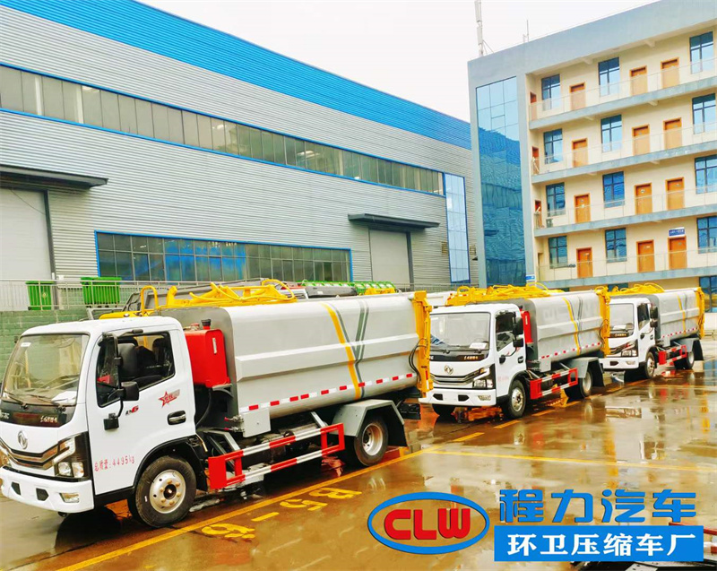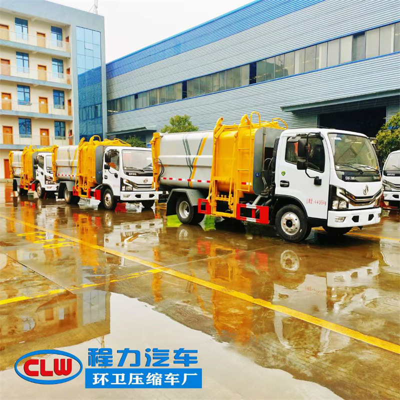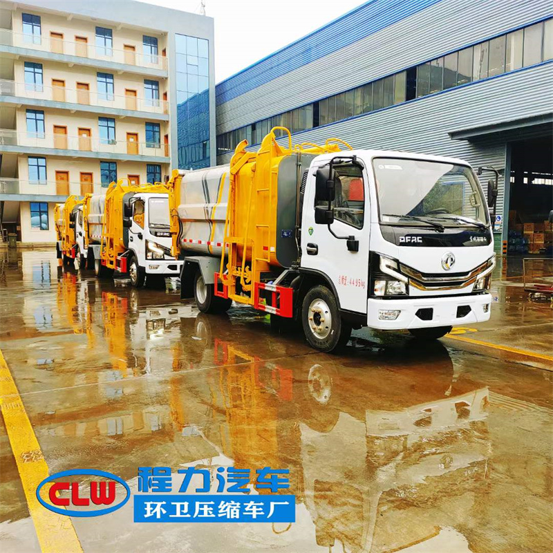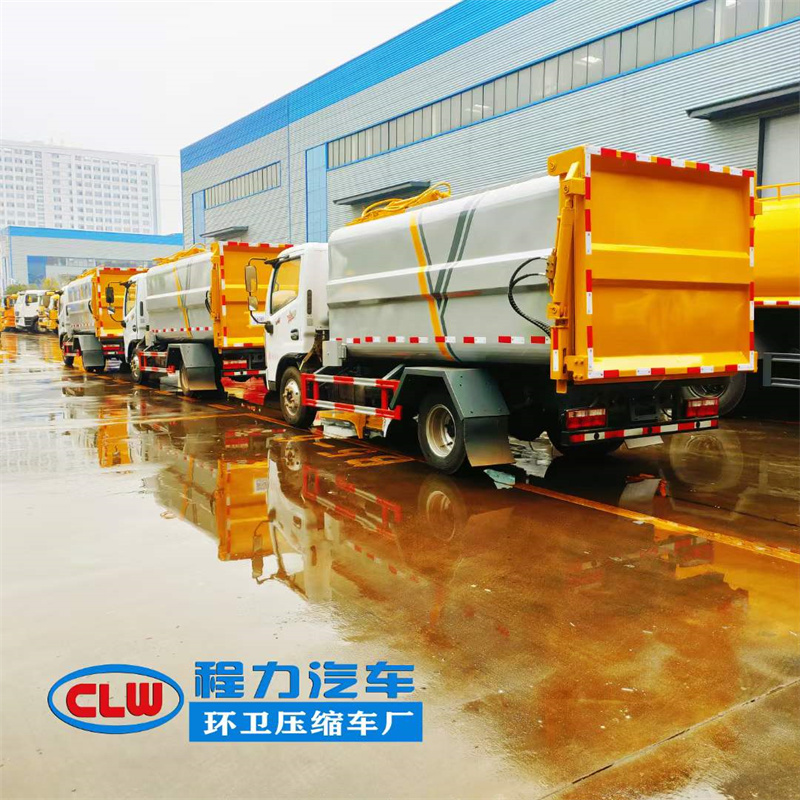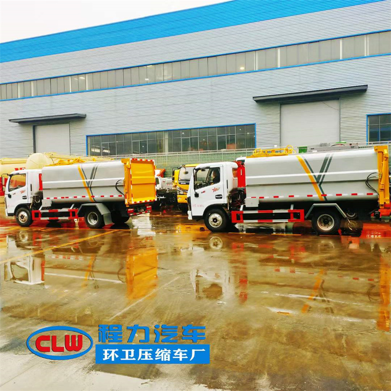 節前發三臺東風多利卡藍牌側裝壓縮垃圾車,全柴115馬力發動機,700鋼絲胎,箱體容積7立方,邊掛240L塑料垃圾車提升機,帶推鏟卸料功能,后門液壓舉升鎖緊。