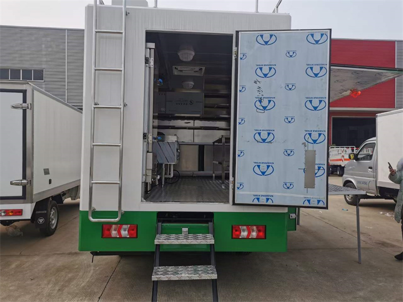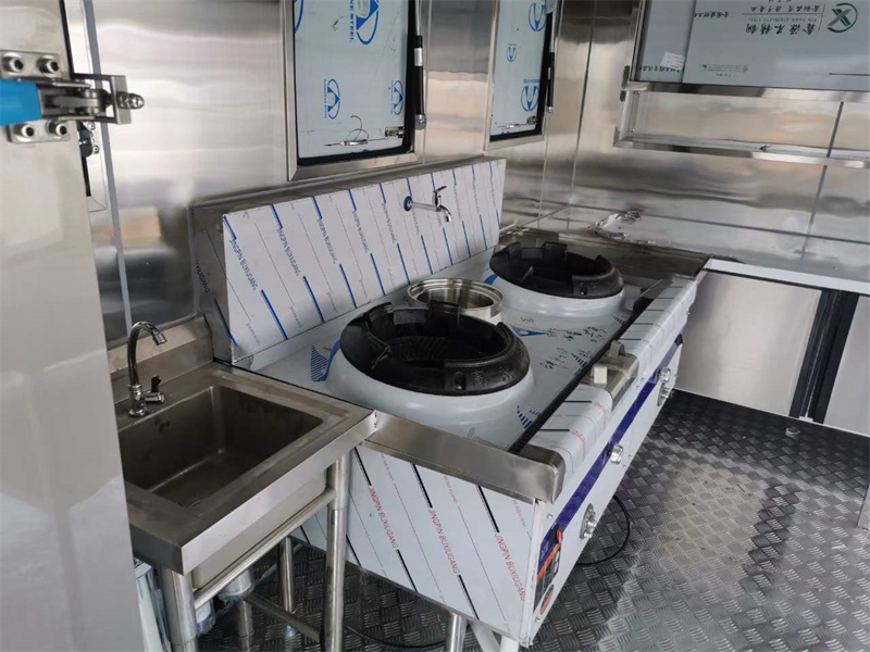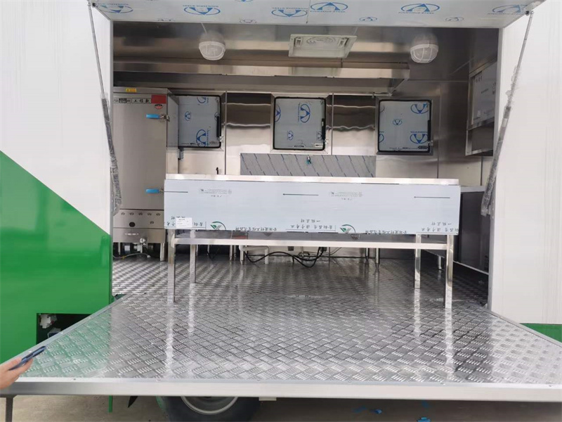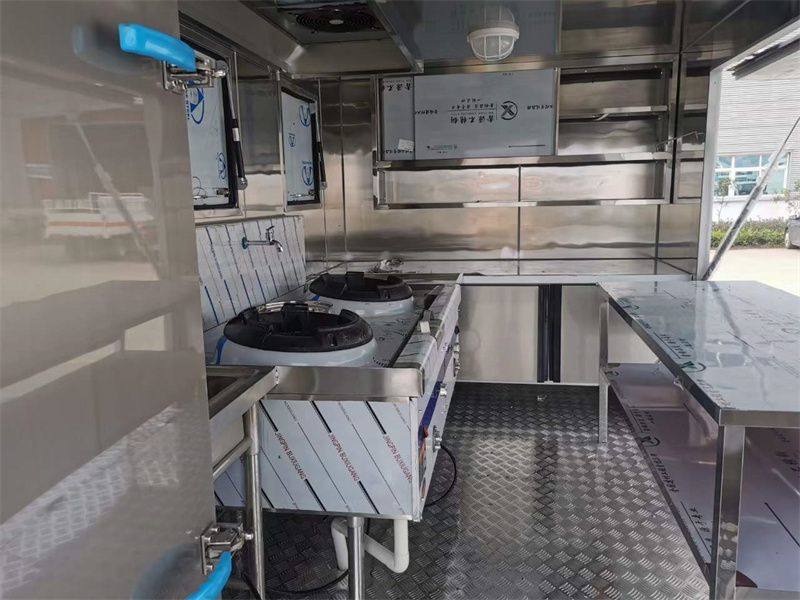 流動做飯餐車上裝配置:箱體外冷板,內(nèi)不銹鋼板,5cm復合保溫板,底板防滑花紋鋁板,廂體帶不銹鋼凈水箱、洗手池、污水箱、燃料箱、不銹鋼爬梯護欄,加裝雙眼灶、平冷柜、蒸飯車、不銹鋼菜架等。