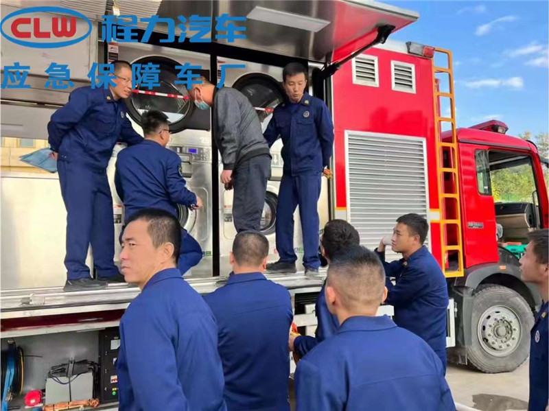 重汽豪沃可移動被服洗滌車,可滿足消防士兵50KG洗衣量同時帶烘干功能, 帶發電機可供洗衣機和烘干機同時工作,并配備有鋁型材置物架放置清洗干凈后的衣服,適用于野外戰訓和消防救援等武警官兵后勤保障服務。
