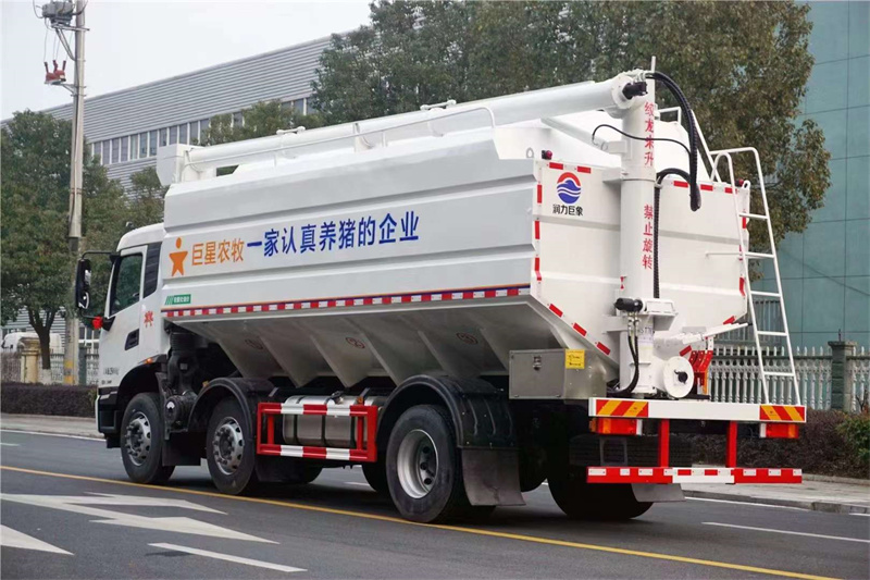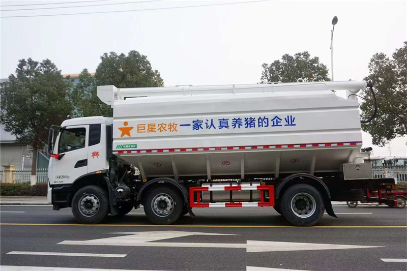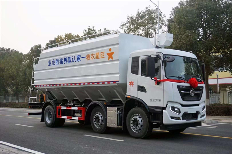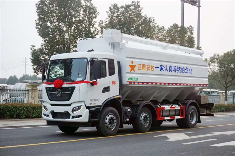 SCS5252ZSLDFH6巨星農牧散裝飼料車(專利產品),東風天錦小三軸32方飼料車,龍擎DDi75E300-60發動機,軸距1995+3500,變速箱9JS119T-B DD,前后橋4.5T雙/10T,輪胎295/80R22.5 18PR,主減速比3.07,板簧片數3/3/10+8,大梁250×80×[7+4],鋁400L油箱,多媒體大屏,原廠空調、中控門鎖,氣囊座椅  前懸加強板簧,取力器,BBM,進口液壓操作系統,廂體容積32立方,整車尺寸9100×2550×3995mm,輕量化設計,整車自重10噸!