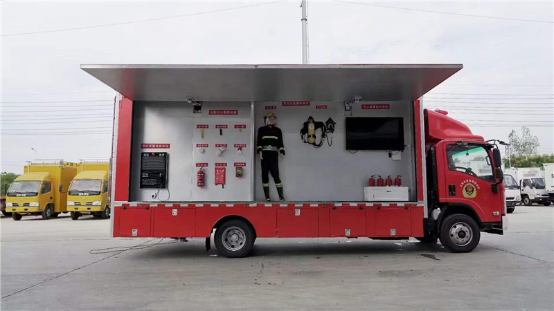 上裝配置:箱體骨架采用優質碳鋼,外部冷板蒙皮,內部鋁塑板內飾,地板防滑鋁制花紋板,骨架整體電泳底漆處理。宣傳模塊部分可選裝LED廣告顯示屏,配置靜音發電機組,外接電源及電腦功放音柱!模擬119報警系統,手持滅火器模擬滅火體驗系統,消防隱患排查系統,電氣火災成因臺,消防標識識別系統,消防器材展示系統等,照明燈,液壓翻板,隨車工具。