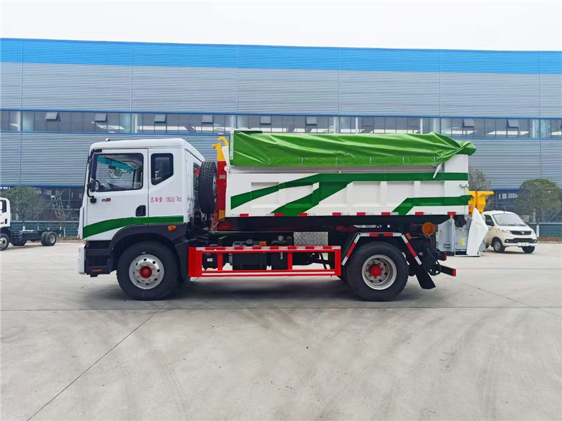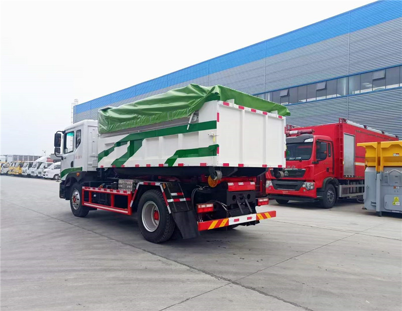 程力汽車研發的新款東風D9建筑勾臂垃圾車帶電動雨篷。工地專用建筑垃圾車。